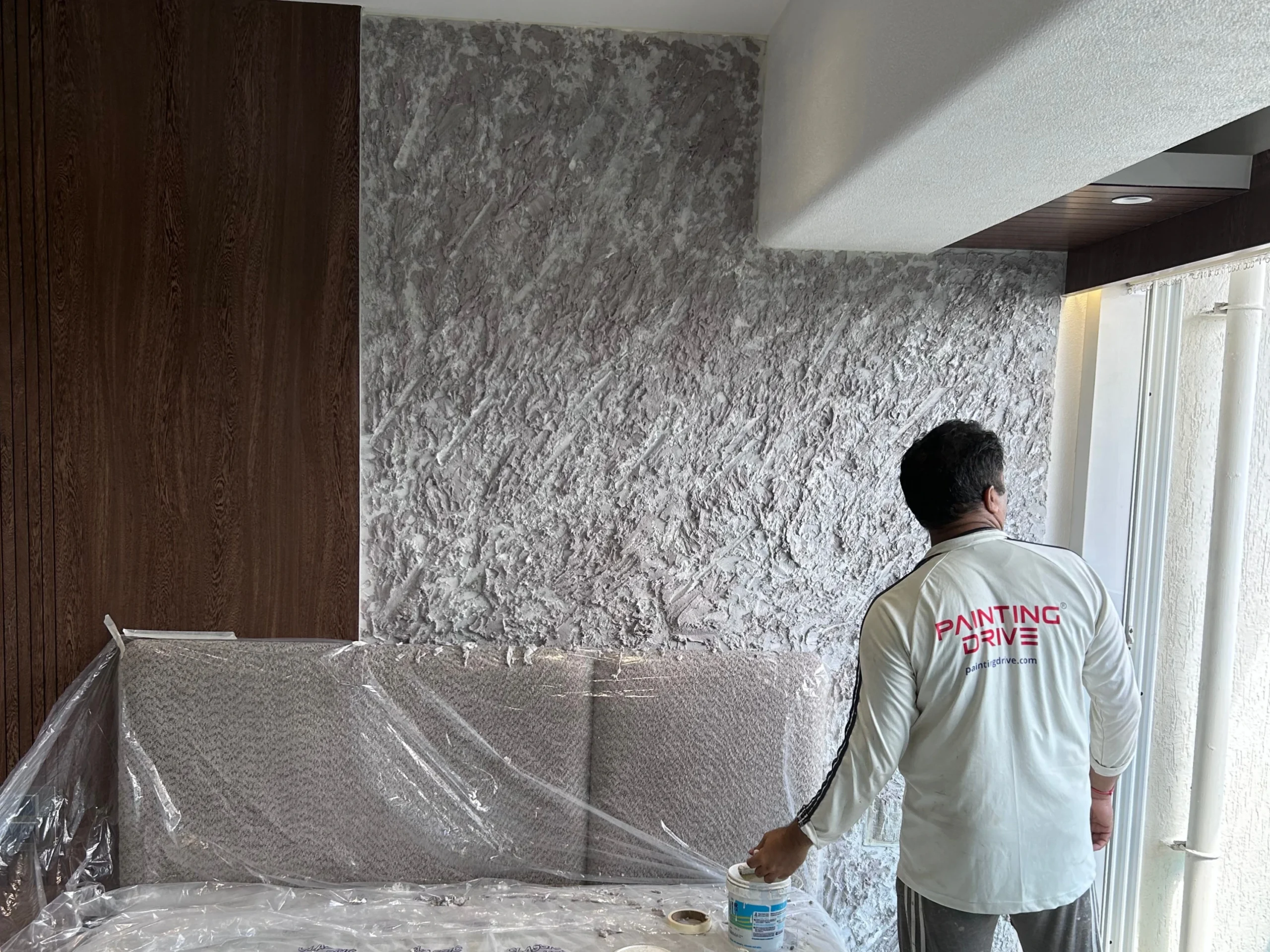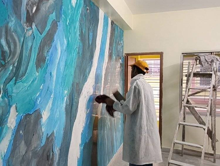 ○ Apply a thick, elastic artistic paint to the wall surface using a textured roller to create the desired texture.